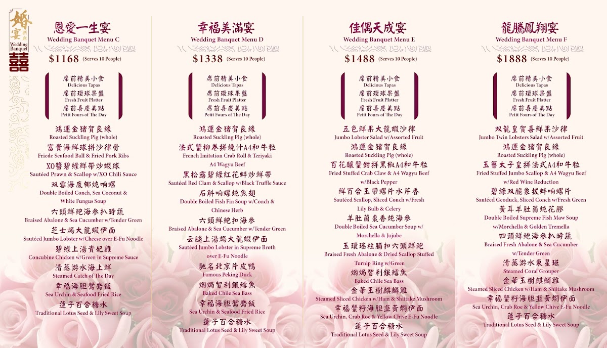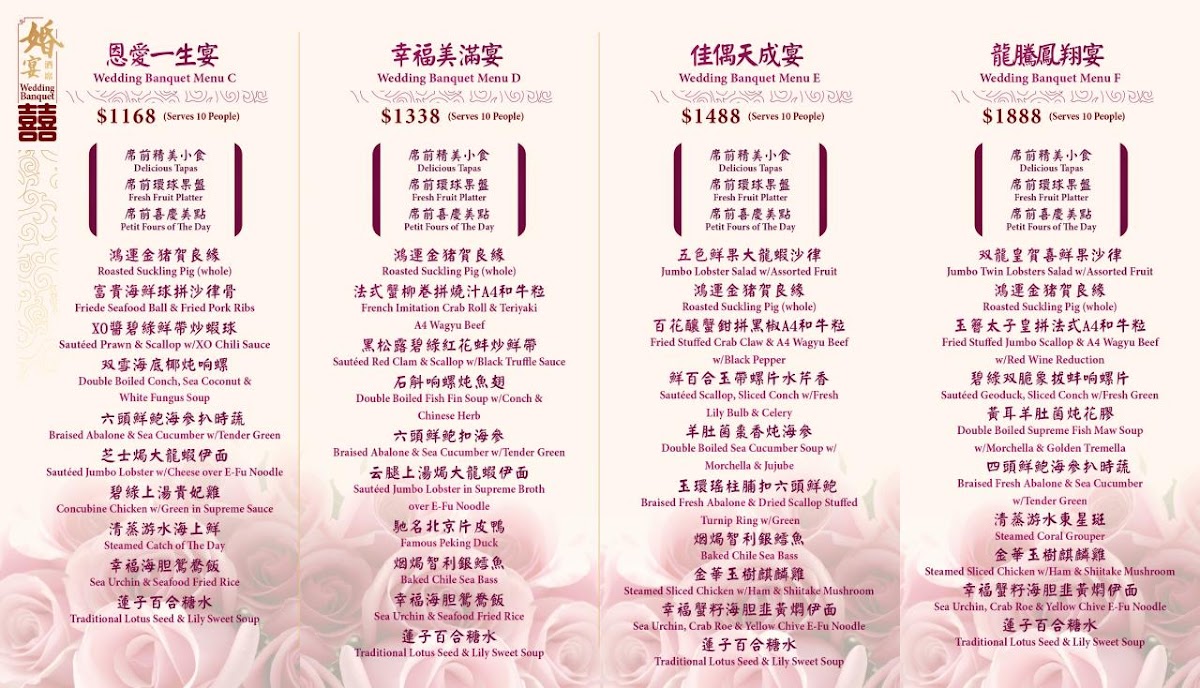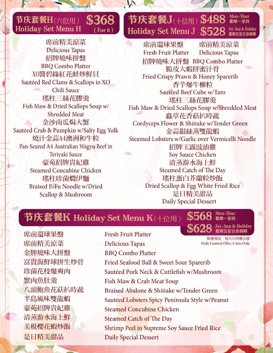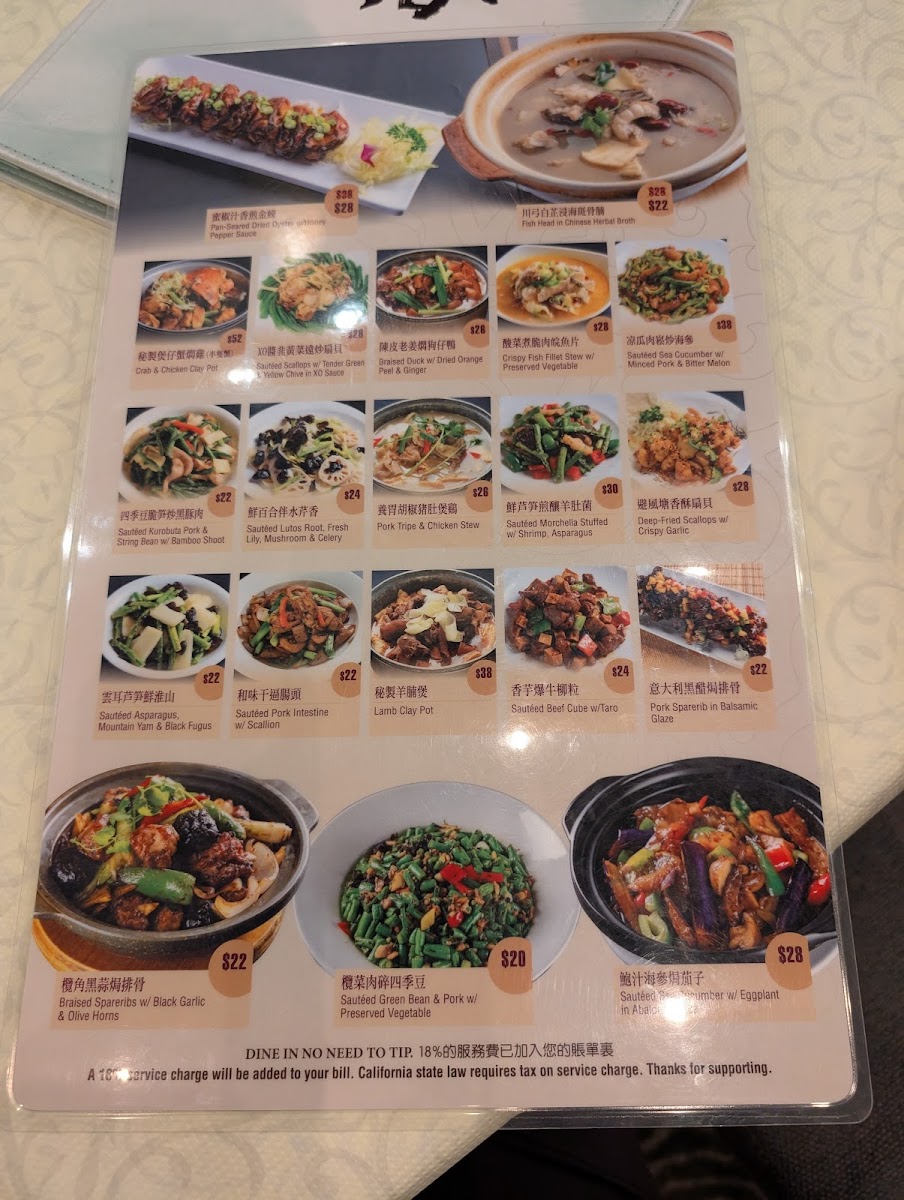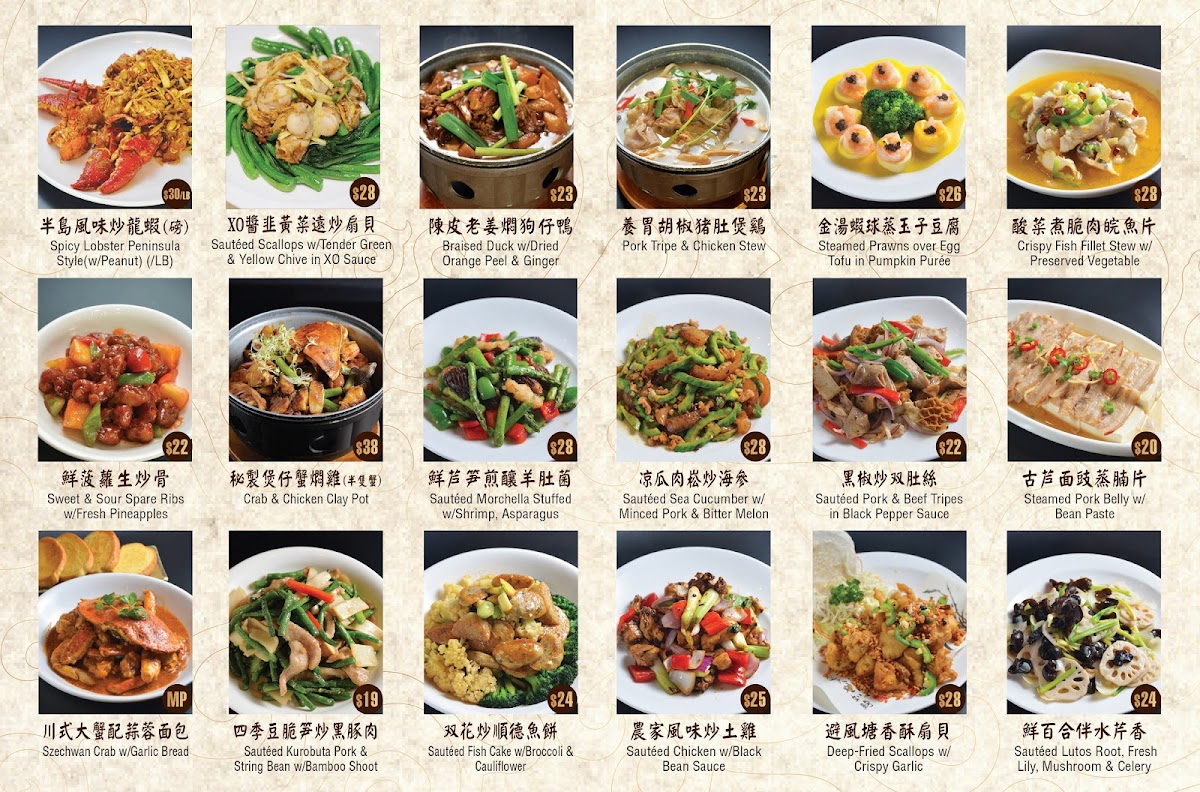 Overall, the menu provides a variety of dim sum specialties and seafood dishes, with notable items like sautéed lobster, steamed fish head with pepper sauce, and sea cucumber with assorted seafood in abalone sauce. Diners can expect options suited for both lunch and dinner, accommodating quick orders as well as more leisurely meals.